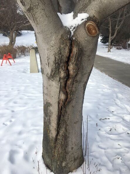 Mechanical stress – Repeated freezing and thawing can also cause mechanical stress to tree tissues. Water expands as it freezes, creating pressure within bark, wood fibers, and roots. Over time, this expansion and contraction can result in frost cracks—long vertical splits in the trunk that occur when the outer layers of wood cool and contract faster than the inner core. Although these cracks may close during warmer weather, they often reopen in subsequent winters, creating long-term weak points. Frost cracks serve as entry sites for decay fungi, insects, and pathogens, accelerating structural decline